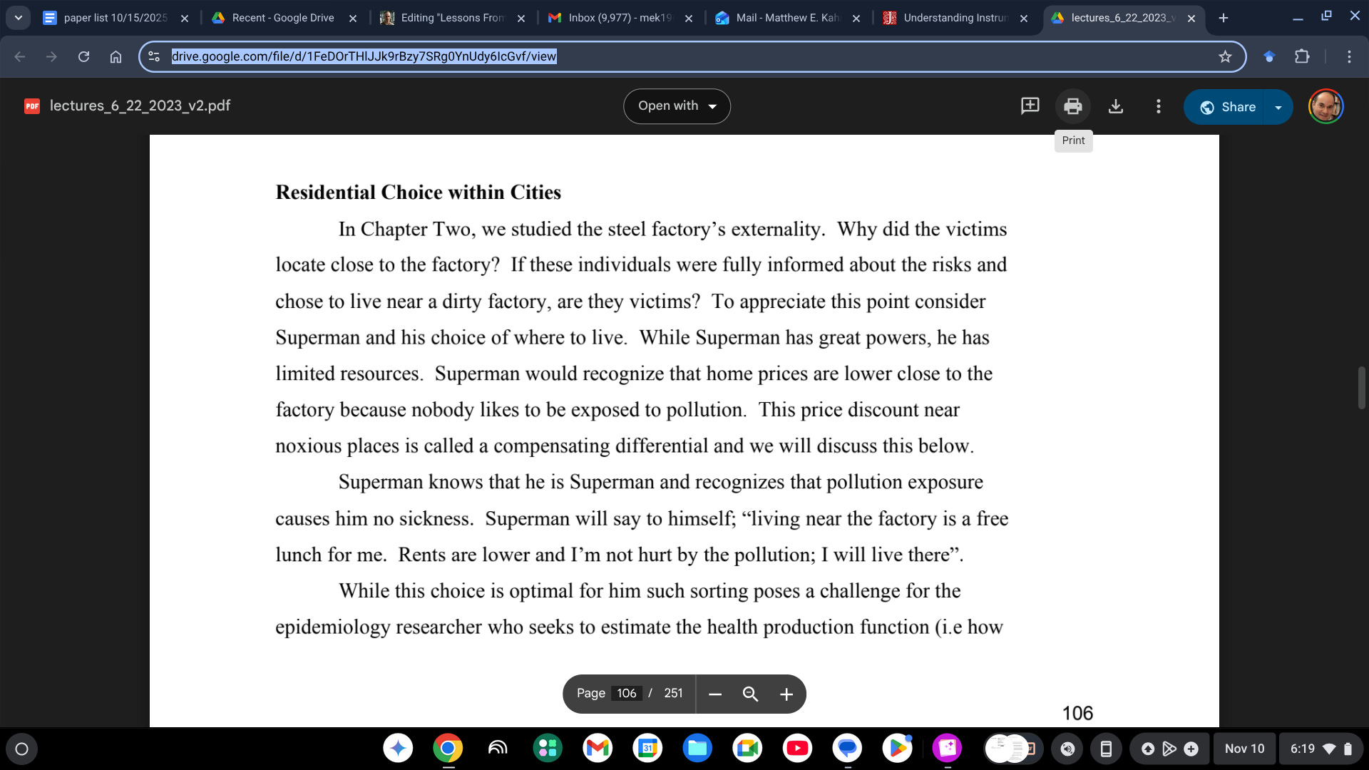 My points here? Since people in the economy know their own “b”, they sort based on this and they play defense against ugly effects by either hiding out in the suburbs (in this example) or buying products to self-protect. The feedback effects from subjects to society actually form the most interesting basis of field experiment research.