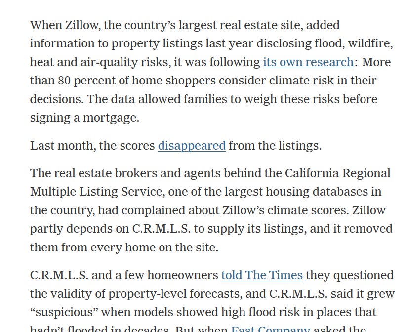 The New York Times has published a good OP-ED critiquing Zillow’s decision to make it more challenging to see the flood risk and wildfire risk scores for a given home. Here is the lead from the piece;